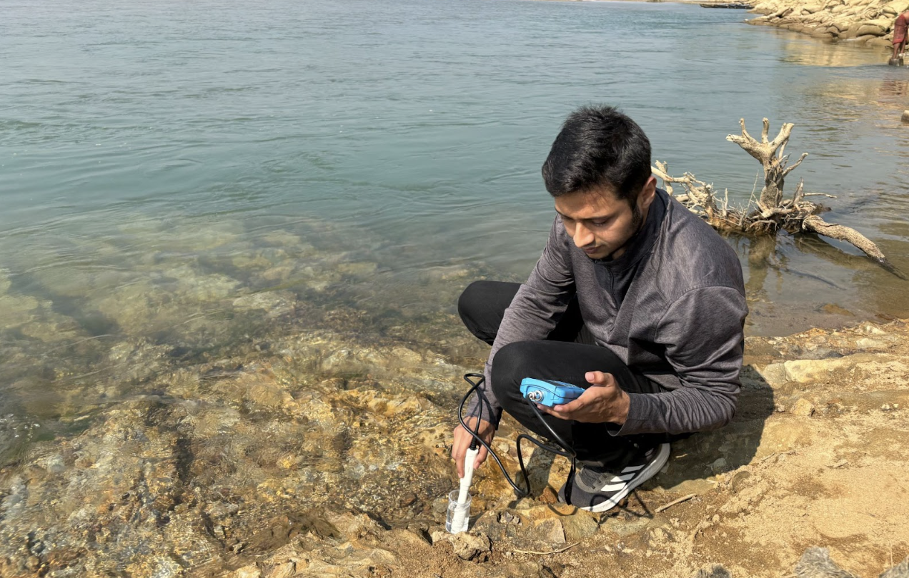 Faisal conducting water quality testing of a river called Shomeshwari