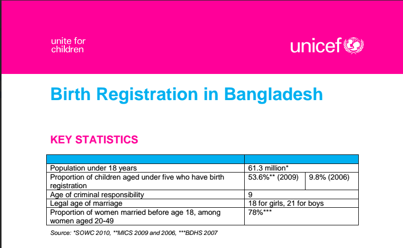 Birth registration is a fundamental human right that is specified in the Convention on the Rights of the Child (CRC). All children have the right to a name, identity and nationality, and birth registration is a first and significant step in upholding these rights. Birth registration is the State’s first official acknowledgement of the child’s existence and is the means to secure other child rights such as access to health care and education.