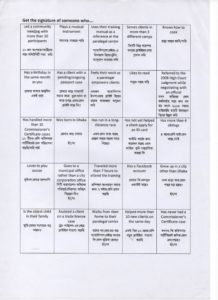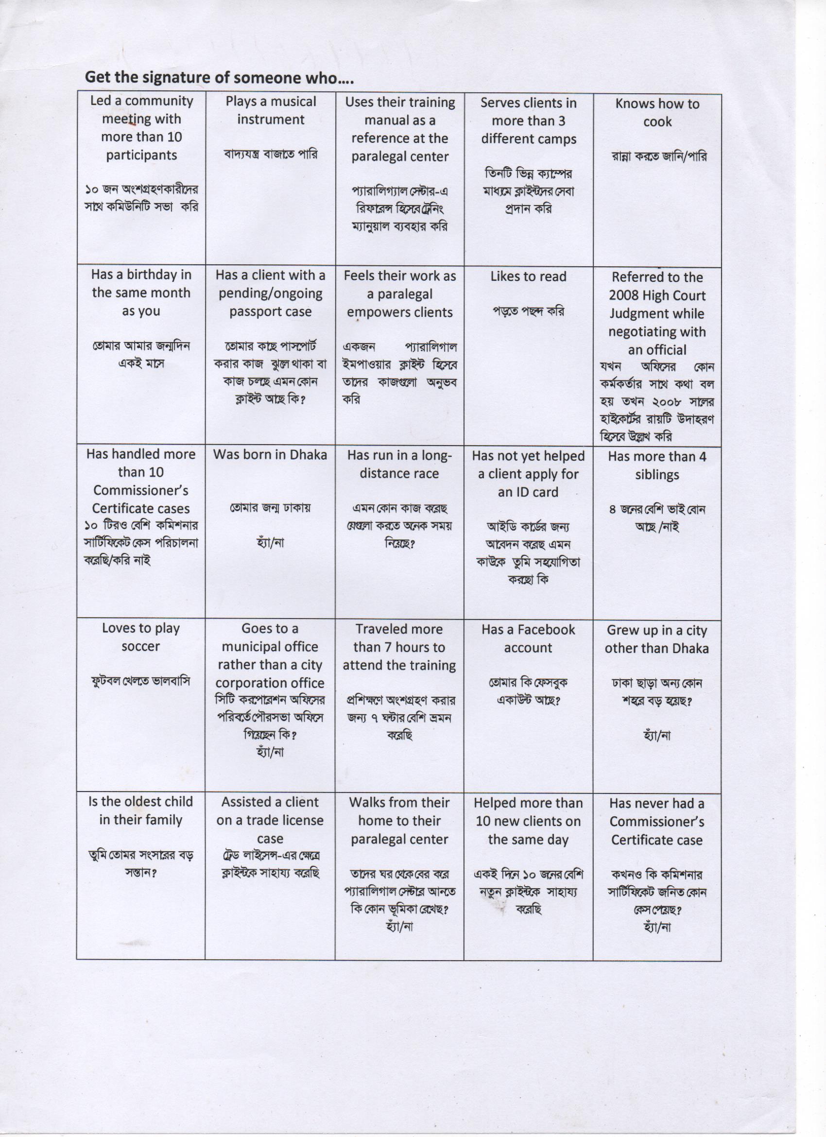 Whoever gets the most signatures in a given amount of time “wins” the exercise and can share a few anecdotes of what they learned about the other paralegals in the process. This exercise was used by Namati and Council of Minorities in a paralegal refresher training in Bangladesh.